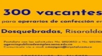 La Agencia Pública de Empleo, APE, ofrece la intermediación para que sean contratadas, por una empresa de la región, 300 personas con experiencia en manejo de máquinas como fileteadora, plana, collarín, dos agujas y especiales. El coordinador de la APE en Risaralda, Carlos Arturo Vergara Garay, explicó que los interesados deben enviar su hoja de vida, antes del 6 de junio, a la cuenta de correo cmejigon@crystal.com.co indicando que se postula para Operario de Confección con cualquiera